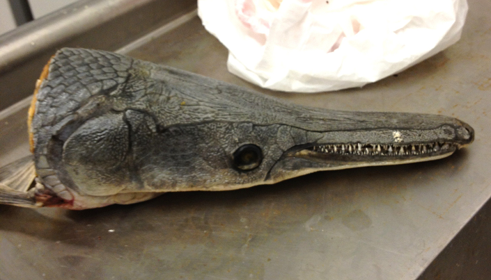 -Following the recent buzz over the giant alligator gar caught in Texas (see previous post) and finally having a small portion of free time while preparing the lab for more gar work, I decided to begin a small project I’ve had on the table (or in the freezer) for a couple years now.  Phase 1 is defrosting a ~14″-long alligator gar (Atractosteus spatula) head which I acquired from colleagues while visiting Nicholls State in Lousiana back in 2010.  I’ll do my best to keep an ongoing update on the project…for now I’m hoping this head will defrost properly over the next couple days before Phase 2!–