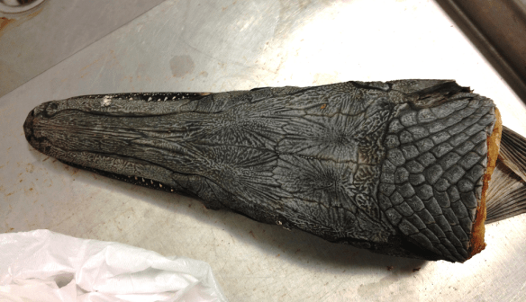 Apologies for the lack of updates on this project and many others, things have been quite hectic over the past couple months with new research projects, a job transition, and more.  Here is the semi-final stage of the alligator gar head project, and it will remain at this stage for a while until some other pieces of the final project can be brought together.  After defrosting the gar and prying the jaws open, it was preserved in a bucket of formalin for several days.  Once formalin preservation was complete, the head was removed and soaked in water for approximately 24 hours (to reduce amount of formalin).  Finally, the head was dried by sitting in the sun/air-dried for several days.  The final product is what you see here; the photo was taken with Instagram, which I have been experimenting with with several primitive fishes as subjects…album coming soon; and you can see some other photos on our facebook page.–