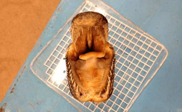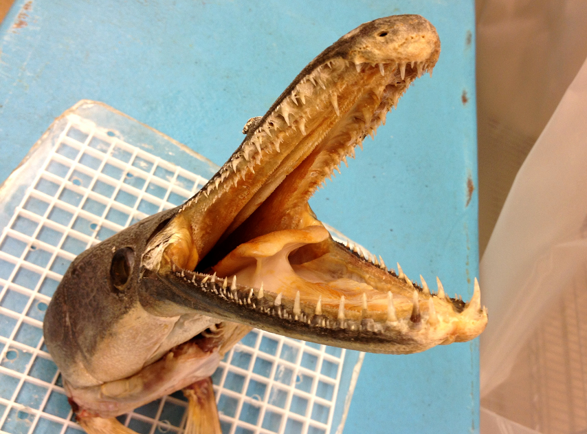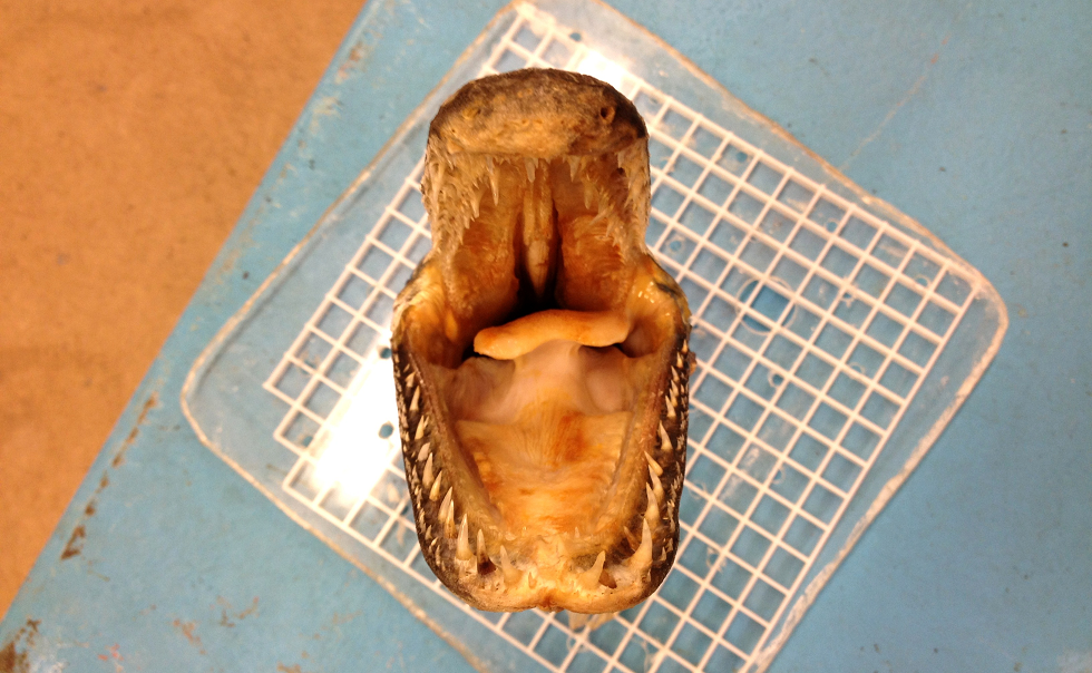 A shot of the head with jaws pried open; note the prominent secondary row of teeth in the upper jaw, which is characteristic of the genus Atractosteus: