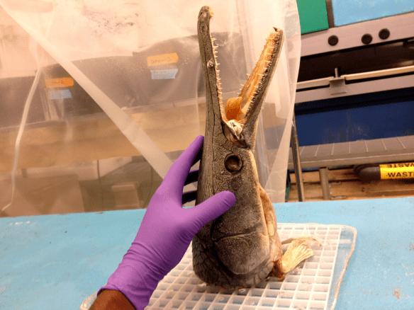 Here’s a quick shot of one of the gar specimens we donated to Shedd Aquarium; this specimen is on exhibit (along with a Shortnose Gar Lepisosteus platostomus) in the recently renovated “At Home on the Great Lakes” Gallery!