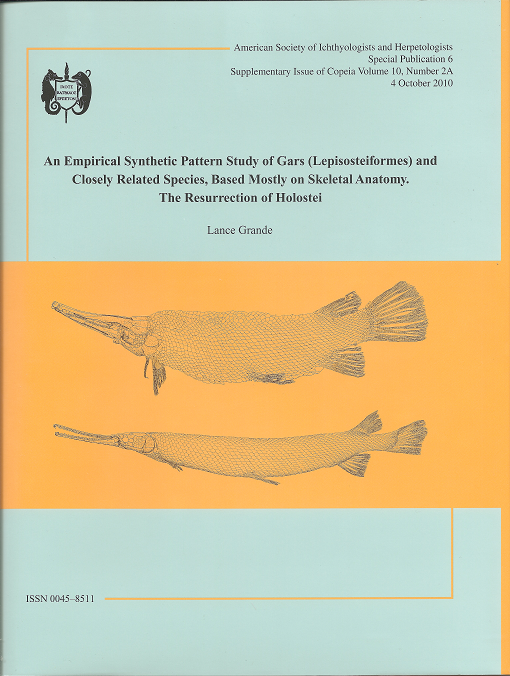 Grande, L. 2010. An empirical synthetic pattern study of gars (Lepisosteiformes) and closely related species, based mostly on skeletal anatomy. The resurrection of holostei. American Society of Ichthyologists and Herpetologists Special Publication 6: i-x, 1-871; supplementary issue of Copeia 10: 2a.